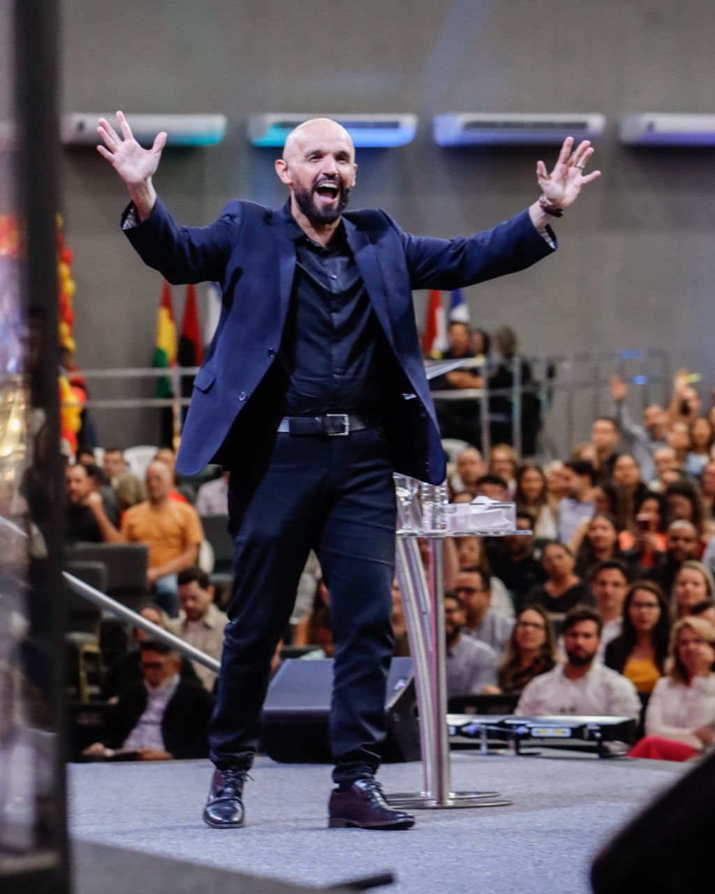 Douglas Ferraz, diretor do Rhema Sede, conduziu os avisos, incluindo a entrada das bandeiras das nações onde a Escola está estabelecida e a execução do Hino Oficial do Rhema Brasil.