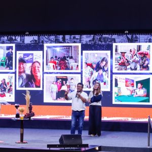 Durante o momento missionário da noite, Celia Regina compartilhou relatos sobre o avanço do Evangelho em Moçambique, destacando os desafios enfrentados no campo e o impacto da pregação da Palavra na transformação de vidas, famílias e comunidades locais.