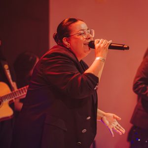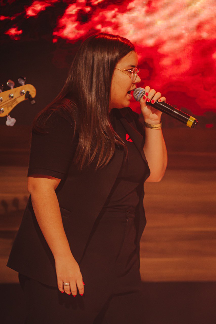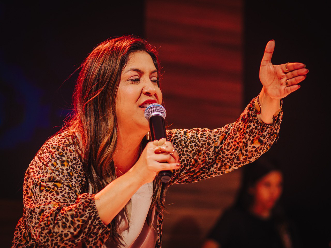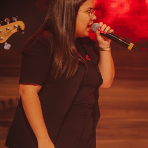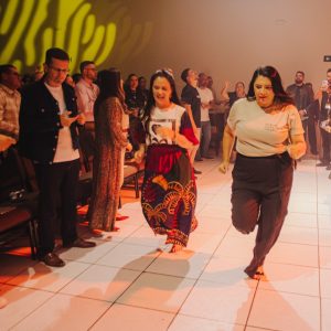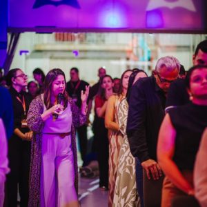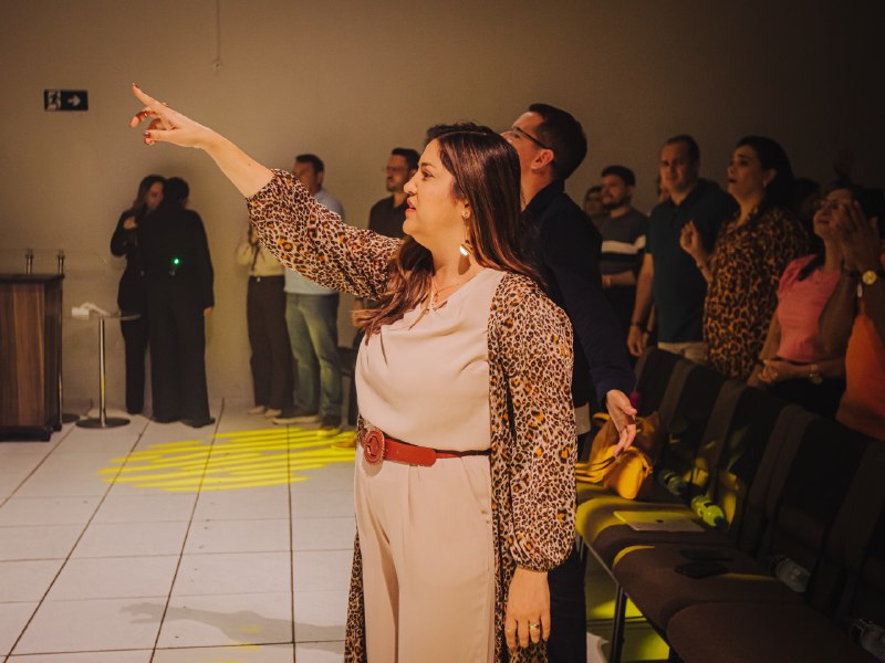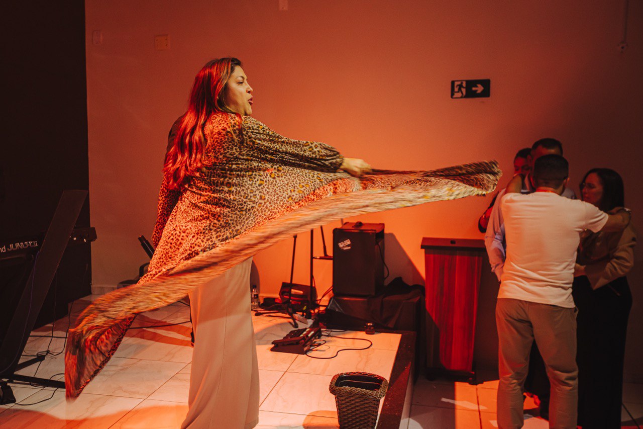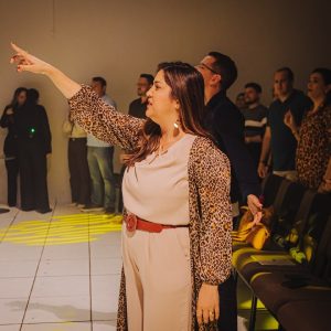 Em seguida, Mizia Elian conduziu a segunda ministração da noite. Guiada pelo Espírito, ela instruiu os irmãos a uma vivência prática das Gotas Proféticas, ativando os participantes com base no texto de Gênesis 2:13. Explicando o significado de Giom, Mizia convocou-os a se tornarem rios transbordantes.