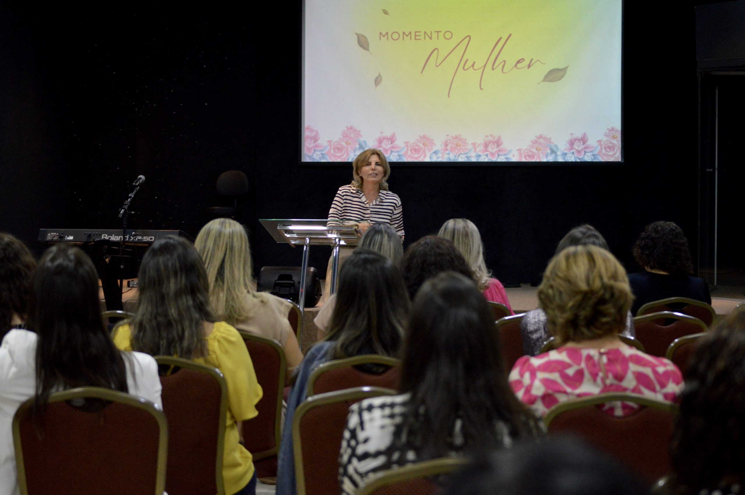 Com o tema Legado, Jussane Ferreira ministrou para 54 mulheres. Na oportunidade, ela foi honrada como referência de fé e amor para as irmãs. “Jussane, você é uma mãe espiritual para todas nós. Por isso escolhemos você para iniciar a nossa programação”, disse Iara Guedes, líder do Departamento.